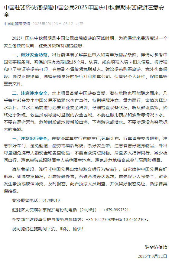 中国驻斐济使馆提醒中国公民2025年国庆中秋假期来斐旅游注意安全