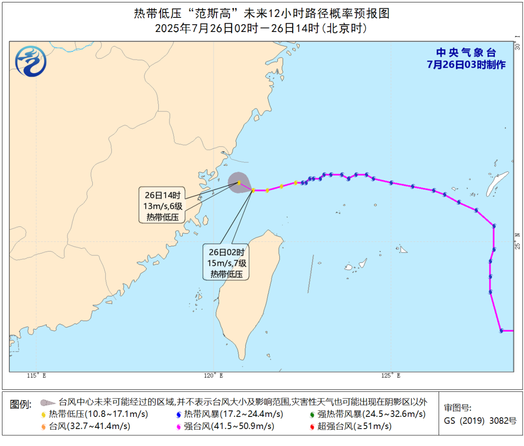 今年7号台风“范斯高”于7月25日1700时在北纬26.5°东经122.3°减弱为热带低压,移动方向偏西,移动速度每小时10-15公里,对辖区影响继续减弱。