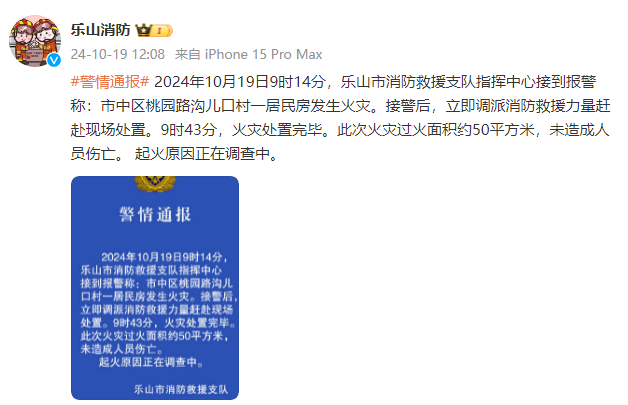 2024年10月19日9时14分,乐山市消防救援支队指挥中心接到报警称:市中区桃园路沟儿口村一居民房发生火灾。接警后,立即调派消防救援力量赶赴现场处置。9时43分,火灾处置完毕。此次火灾过火面积约50平方米,未造成人员伤亡。起火原因正在调查中。