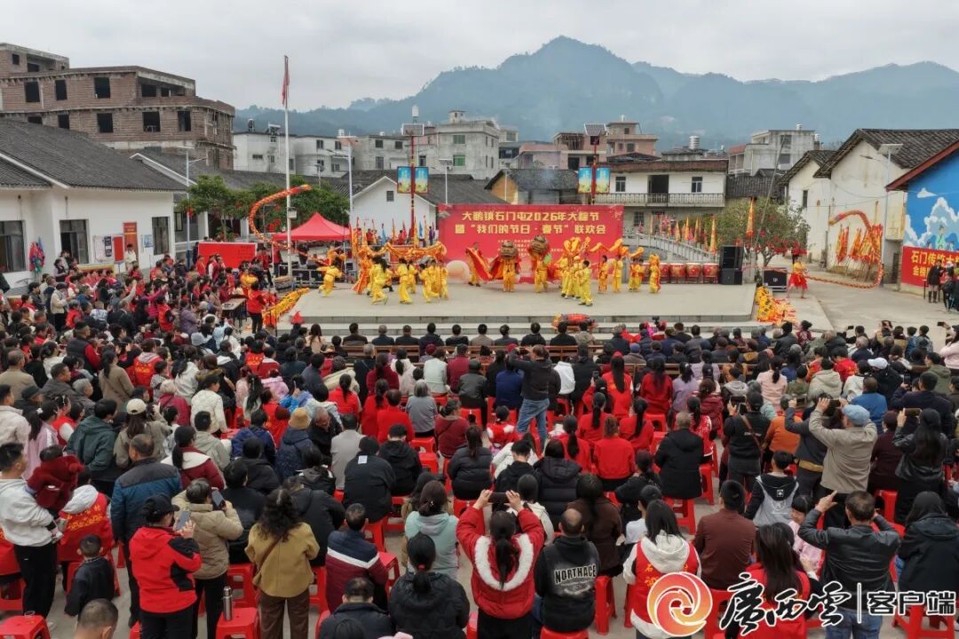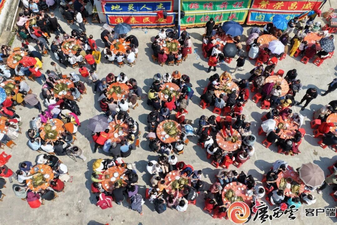 2月20日,平南县大鹏镇石门大粽节在中国传统村落石门屯举行。活动现场摆下四五十桌流水席,让村民、游客免费品尝大粽等当地特色美食,大家共享团聚时光,其乐融融。