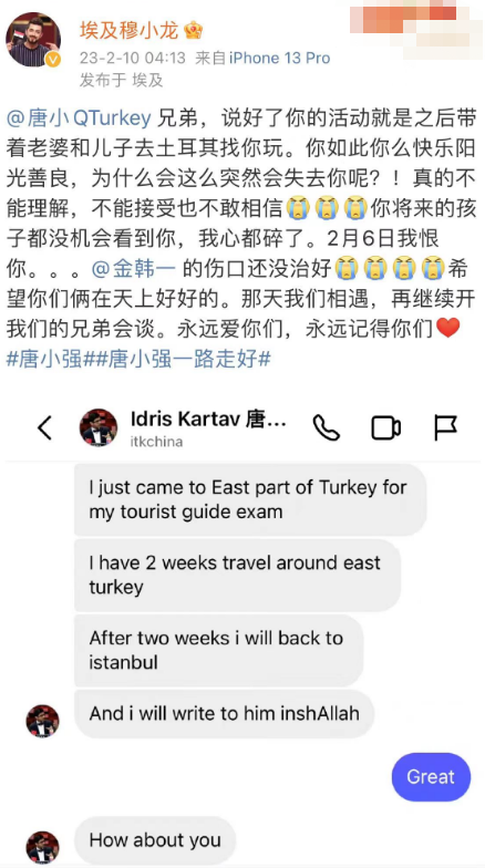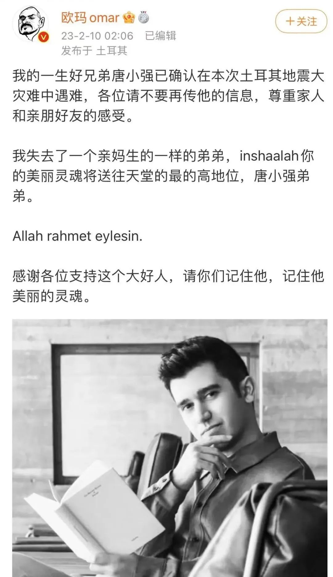 在土耳其地震中被埋于酒店废墟的国内综艺节目《非正式会谈》嘉宾唐小强(Idris Talha Kartav),于2月10日凌晨被救援人员找到时已遇难,年仅31岁。