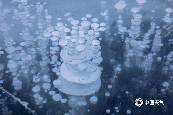 据北京科学中心分析,冰泡即冰冻气泡,形成要具备三个条件:水草、低温和大风。湖底的水草和藻类死亡后腐烂分解出大量的沼气,当冬天温度下降非常快,湖面在短时间快速结冰,而且结冰的速度快于甲烷冲出湖面的速度时,甲烷无处可逃,只能被困在冰层中,一层一层像盖楼一样形成一个个冰泡泡。那么,为什么还需要大风呢?大风的作用有两方面,一方面是加速湖水降温,另一方面正是大风将湖面的积雪吹走,另外高速的大风还有打磨冰面的作用,让观看效果更加清晰透明。