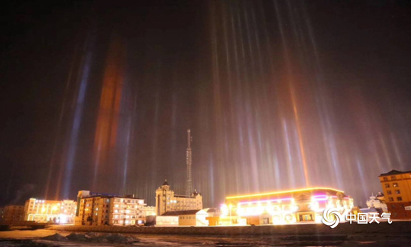 这个是寒夜灯柱现象,在锡林浩特、根河等地比较常见,其他地方记录较少。寒夜中灯柱的出现,是由于在天气静稳的前提下,冰晶全部悬浮在空中,整层的大气成为了地面上灯光的“幕布”,从而将地面的灯火反射到了夜幕之上。