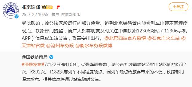 据国铁济南局微博消息,7月22日9时10分,受强降雨影响,途经京九线郓城站至梁山站区间的K732次、K892次、T182次等列车不同程度晚点。