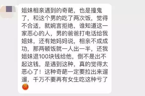 相亲完都过了一个多月了,他爸爸突然给我妈打电话,说两人没成的话,那两顿饭钱就一人出一半,让我退一百块给他儿子。我妈都‘懵’了,从来没遇到过这种人!我就跟我妈说不要理他……结果他爸爸又打电话来催,还说不还钱就找我领导反映,简直无语了……”