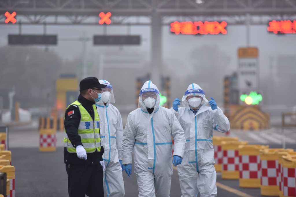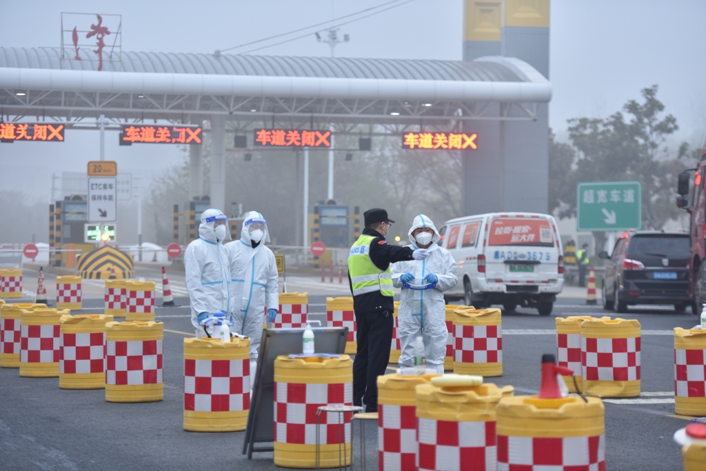 2022年4月7日晨,江苏淮安,洪泽区迎来大雾天气,高速公路入口关闭,疫情防疫人员坚守一线。