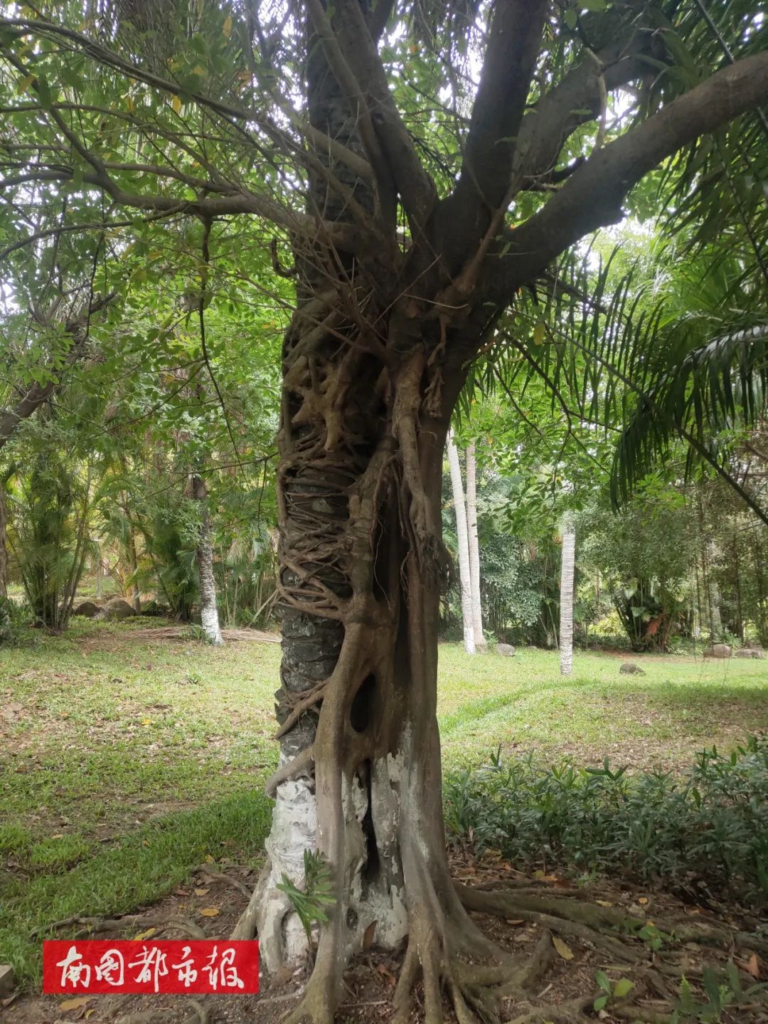 范先生信里提到的两棵树位于海口人民公园南门健身区右侧小路旁,记者现场看到,两棵树长势很好。只是,范先生信中所称被榕树拥抱着的“椰子树”,其实是油棕树。 这棵油棕树粗大挺拔,枝叶茂盛,高约16米。那棵榕树紧紧环抱着油棕树,缠绕着树干“野蛮生长”。