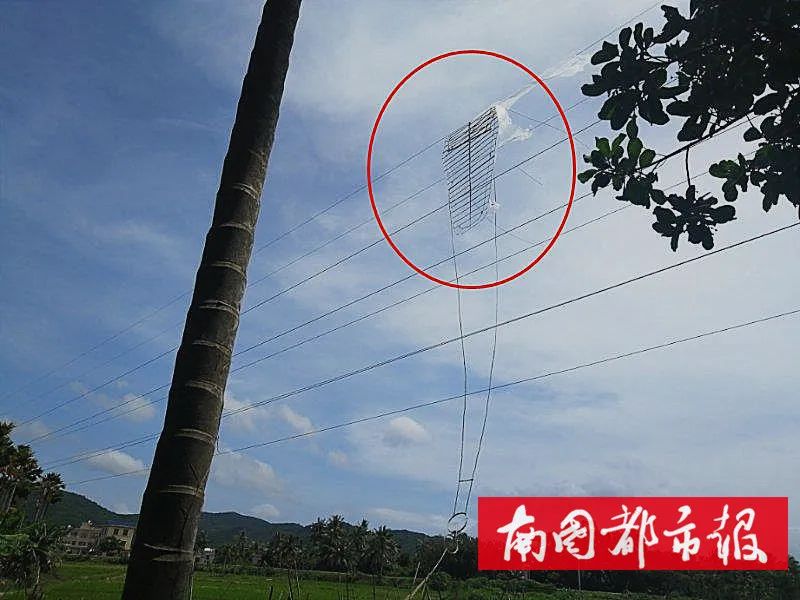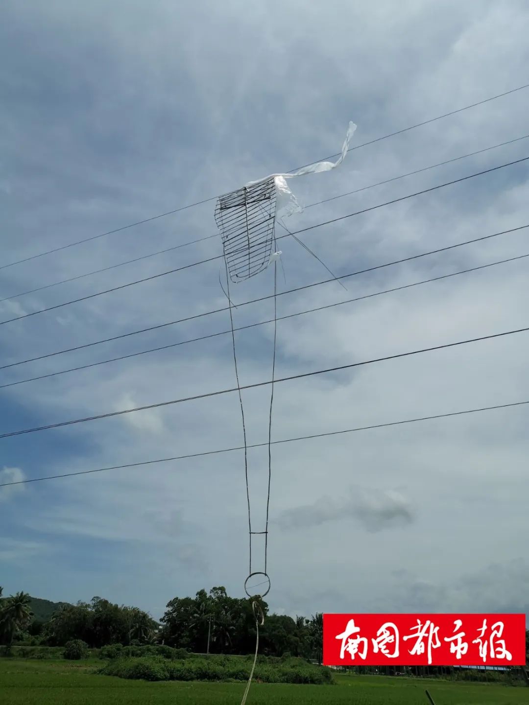 万宁礼纪镇红群村委会洪井园村,超大风筝挂落高压线。礼纪派出所供图。
