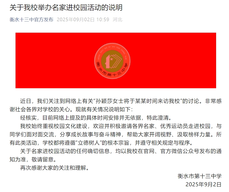 “孙颖莎将于某某时间来访”?衡水市第十三中学通报:网络上提及具体时间安排并无依据