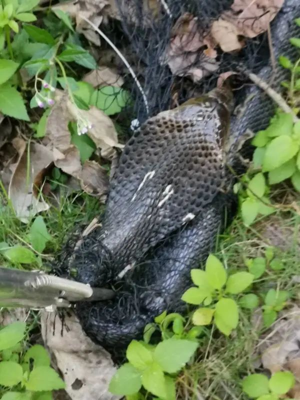 10月1日下午5时左右,大运城派出所民警正在大运公园及周边巡逻,途经公园外围一处枝叶葱茏的矮树丛时听到有异常响动上前查看。走近一看,竟发现一条粗壮的蓝黑色大蛇正试图冲破防遮网爬上大路。