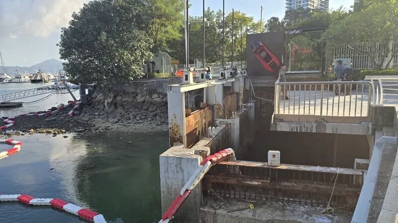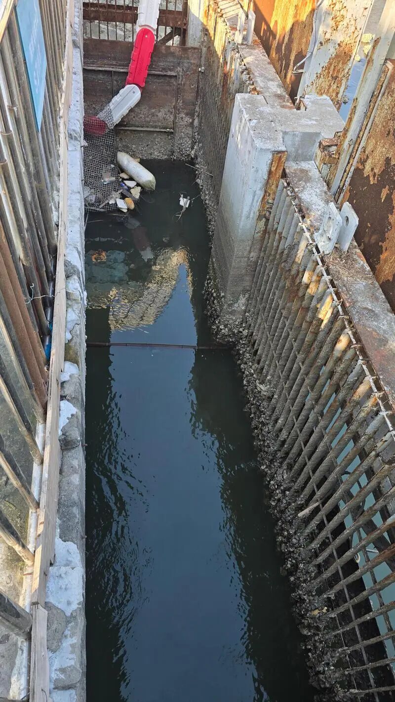 10月15日下午,记者根据“蛇口渔民”发布的位置,前往深圳湾游艇会旁边的滨海栈道找到了其反映的排水口。该排水口直通深圳湾,前有铁质水闸隔离出一片区域,用于阻挡潮汐。下午涨潮时,海水略微反涌进排水口。排水口隔离带内东侧有不少漂浮垃圾。水闸下段,也确实有很多贝类附着。