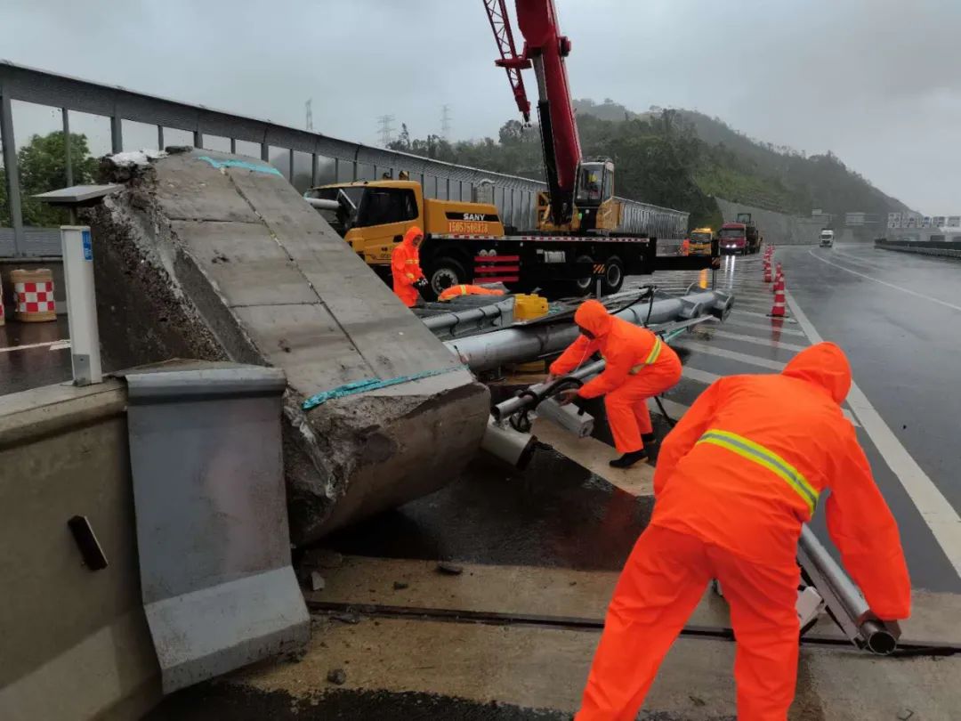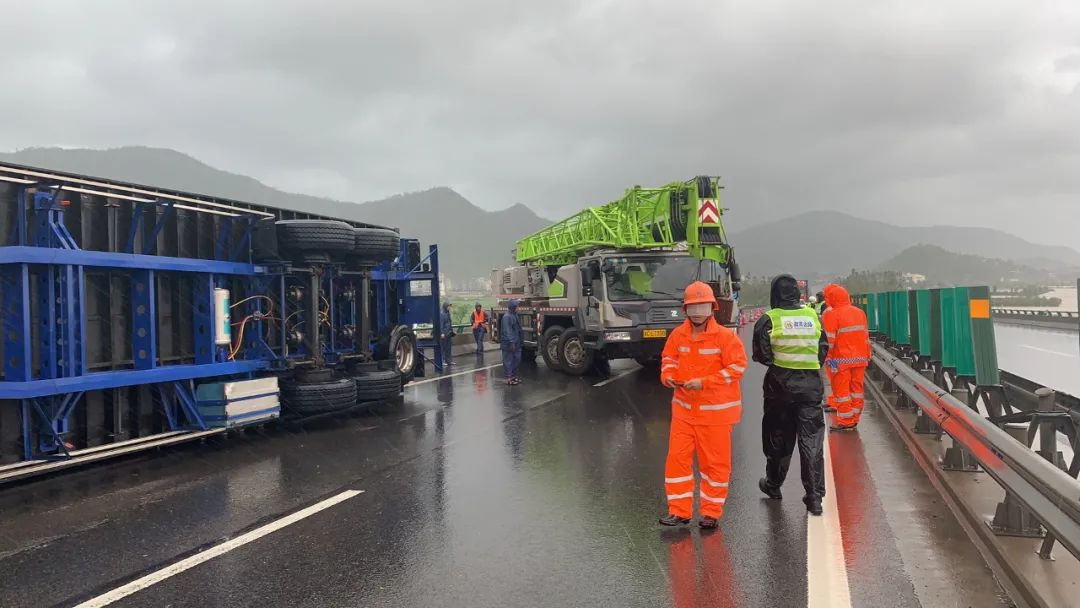 △4日凌晨4时,一辆重型货车由北往南驶经清江大桥时,侧翻在高速路面。甬台温高速清障队伍接警后第一时间出动,赶到现场后一边联合轮胎车施救,将驾驶员救出驾驶室,一边预警封闭事故现场,同时调度2台75吨吊车前往事故现场协助处置。上午9时许,台风影响逐渐减弱,清障队伍指派小拖引导吊车前往事故现场,并于11时终于成功将翻车的重型半挂车扶正再由拖车拖离现场,高速公路恢复通行。