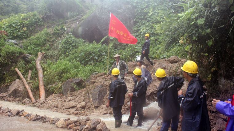浙江省永嘉县云岭乡受灾严重,暴风雨导致临近山体塌方,多处道路中断。8月4日上午8时,得知山体塌方消息后,中国铁建所属中铁十六局集团温州永嘉高速项目部迅速组建20余人抢险突击队,调集2台铲车、挖掘机及铁锹、雨衣等抢险物资第一时间赶赴现场,冒雨开展抢险工作。因雨势风势不断加大,山体被暴雨冲刷下滑,全体救援人员与时间赛跑,动用铲车现场清理了2处垮塌山体及树木、碎石等障碍物,利用片石堆码形成1米左右挡水墙以阻挡洪水,经过7小时连续作业,成功排除安全隐患,打通了村民出行道路。
