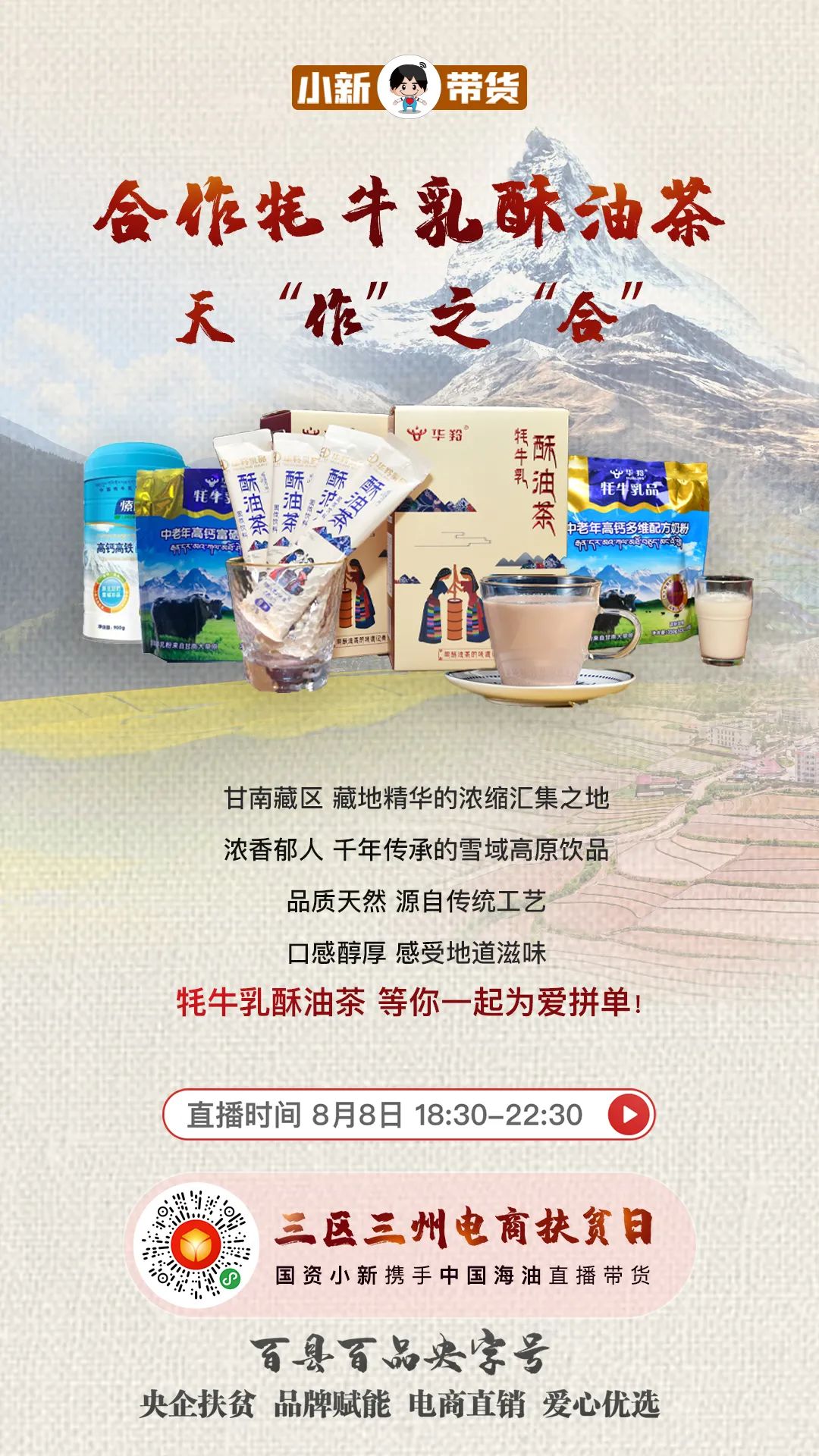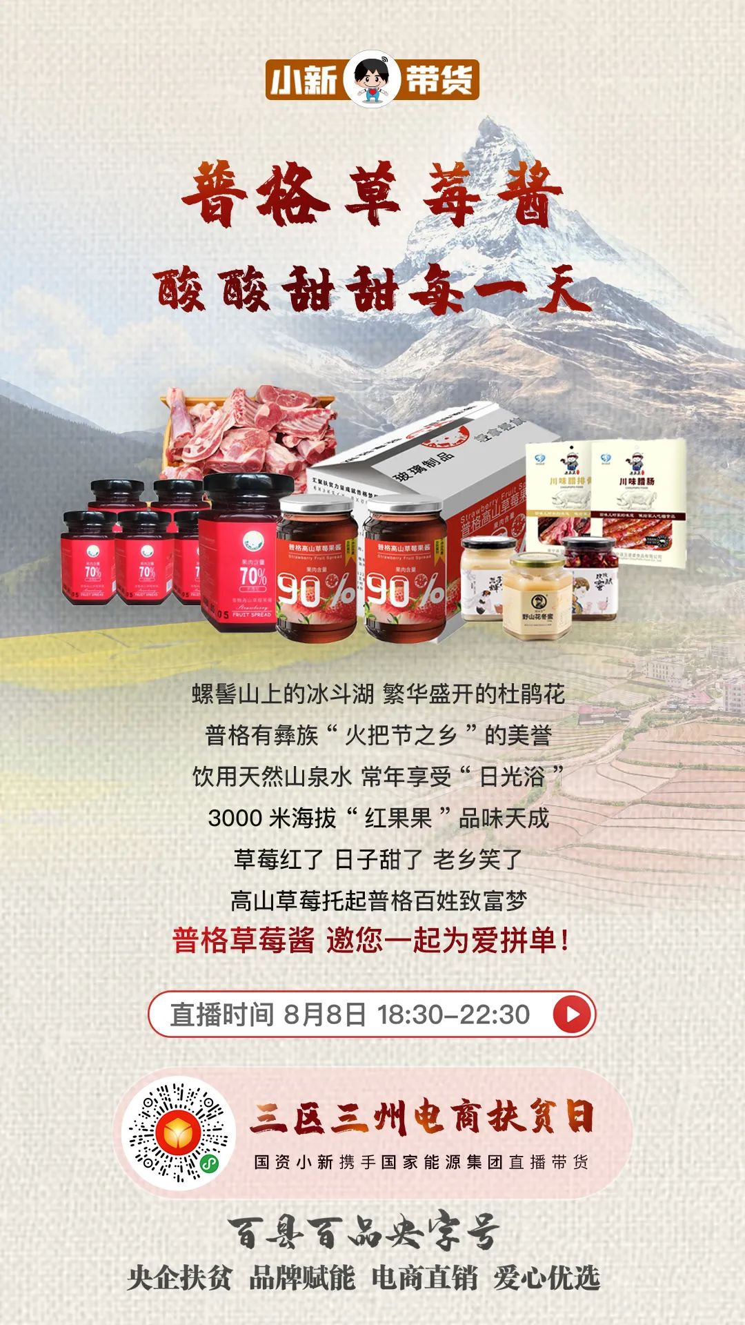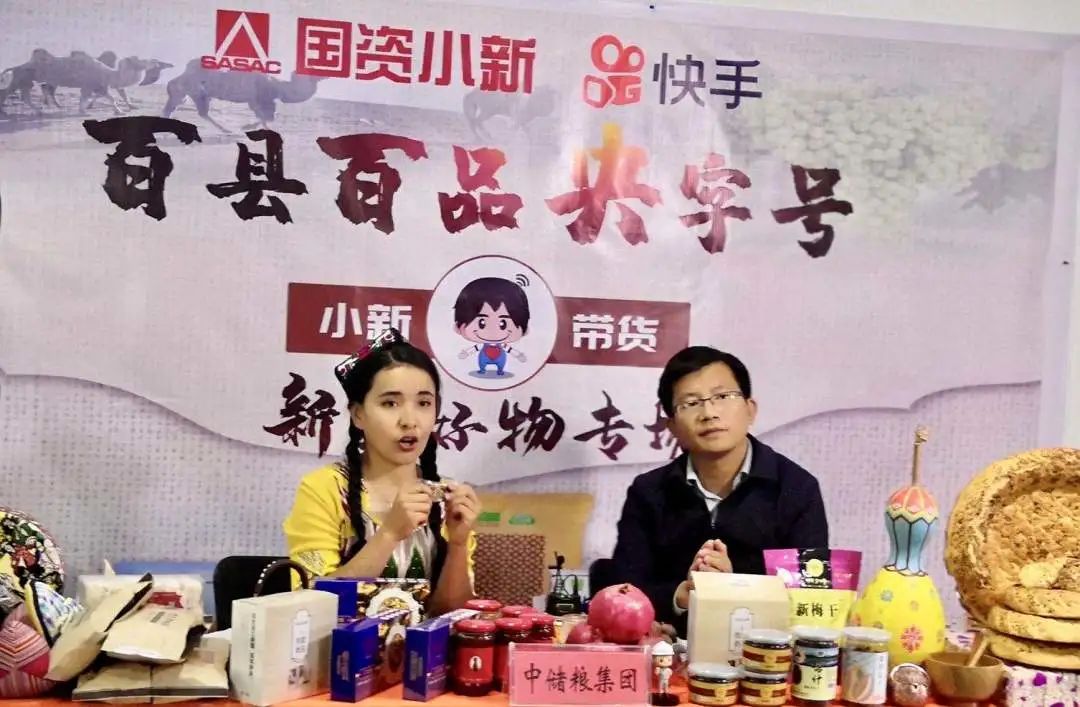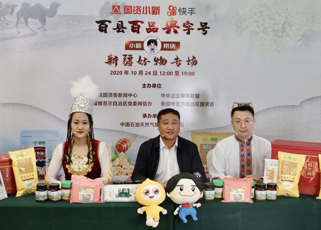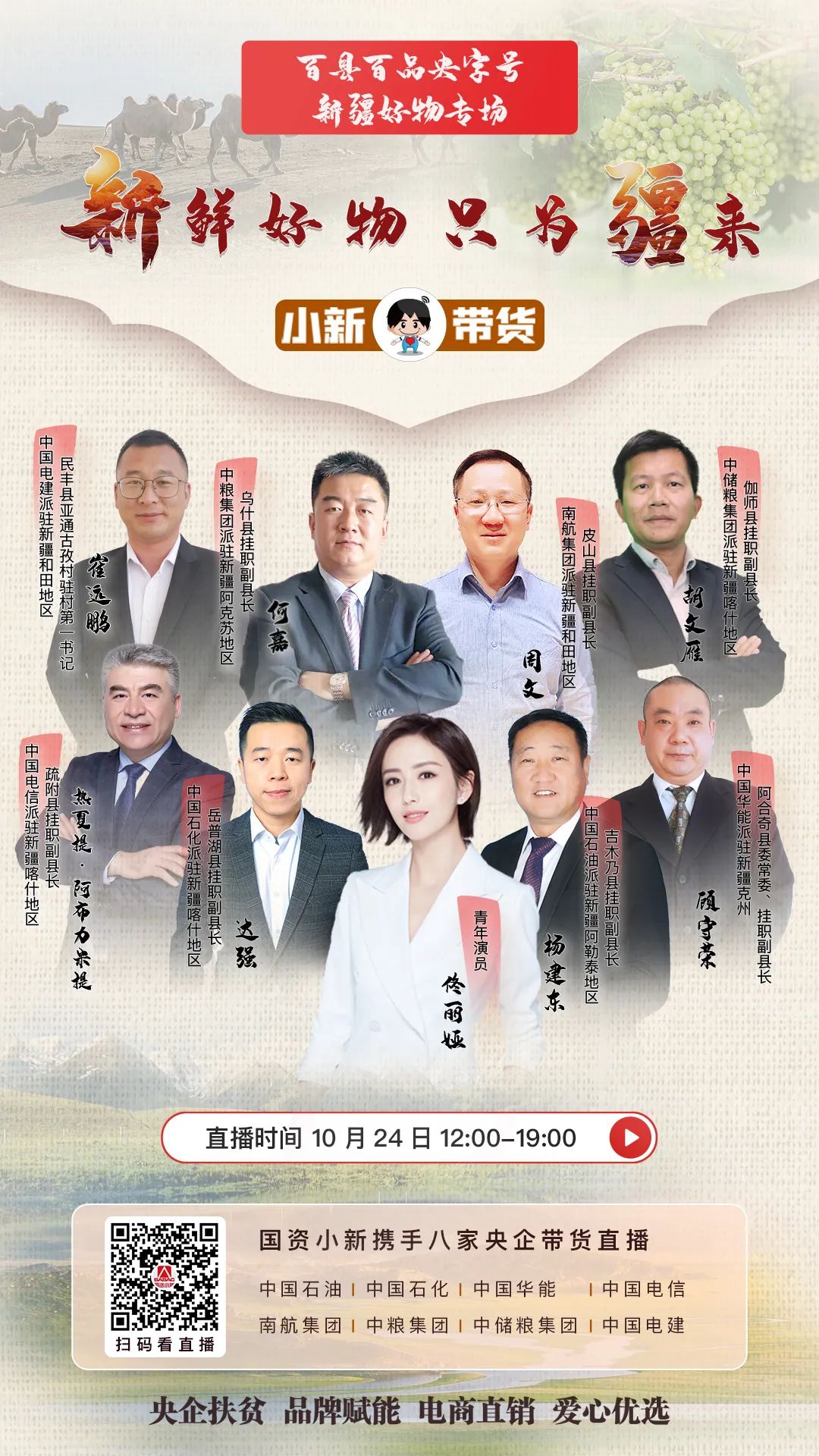 8家中央企业扶贫干部携手定点扶贫县特色产品亮相直播间,包括中国石油帮扶的新疆维吾尔自治区阿勒泰地区吉木乃县、中国石化帮扶的新疆维吾尔自治区喀什地区岳普湖县、中国华能帮扶的新疆维吾尔自治区克孜勒苏柯尔克孜自治州阿合奇县、中国电信帮扶的新疆维吾尔自治区喀什地区疏附县、南航集团帮扶的新疆维吾尔自治区和田地区皮山县、中粮集团帮扶的新疆维吾尔自治区阿克苏地区乌什县、中储粮集团帮扶的新疆维吾尔自治区喀什地区伽师县、中国电建帮扶的新疆维吾尔自治区和田地区民丰县。