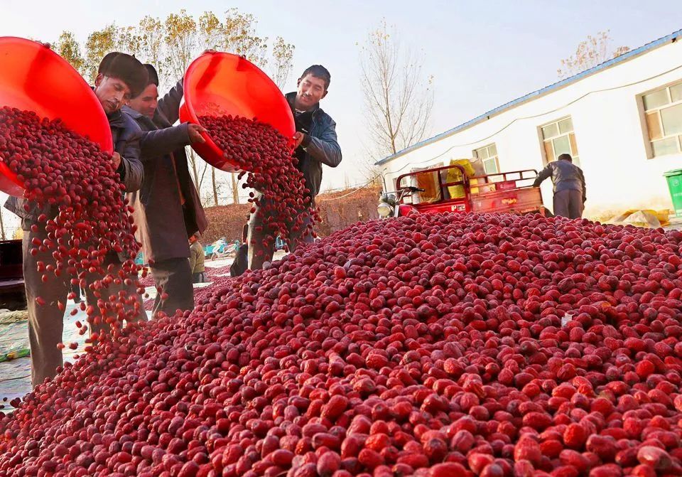 ▲在中国石化帮扶的岳普湖县,红枣又到了收获的季节,但和以往不同的是,枣农们不用再担心红枣的销路不畅、卖不上好价钱。