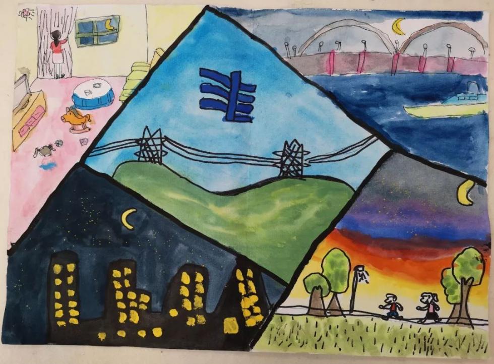 7岁的谭雯睿,妈妈是南方电网广东佛山高明供电局职工。绘画以五宫格的形式组成,第一个场景是一位妈妈做好了可口的饭菜,拉开窗帘见到了万家灯火。第二个场景是桥上明亮的灯光和江面的轮船,第三个场景是在华灯初上的夜晚,一盏盏明灯照亮了回家的路。第四个场景是在路灯照耀下嬉戏着回家的小伙伴。