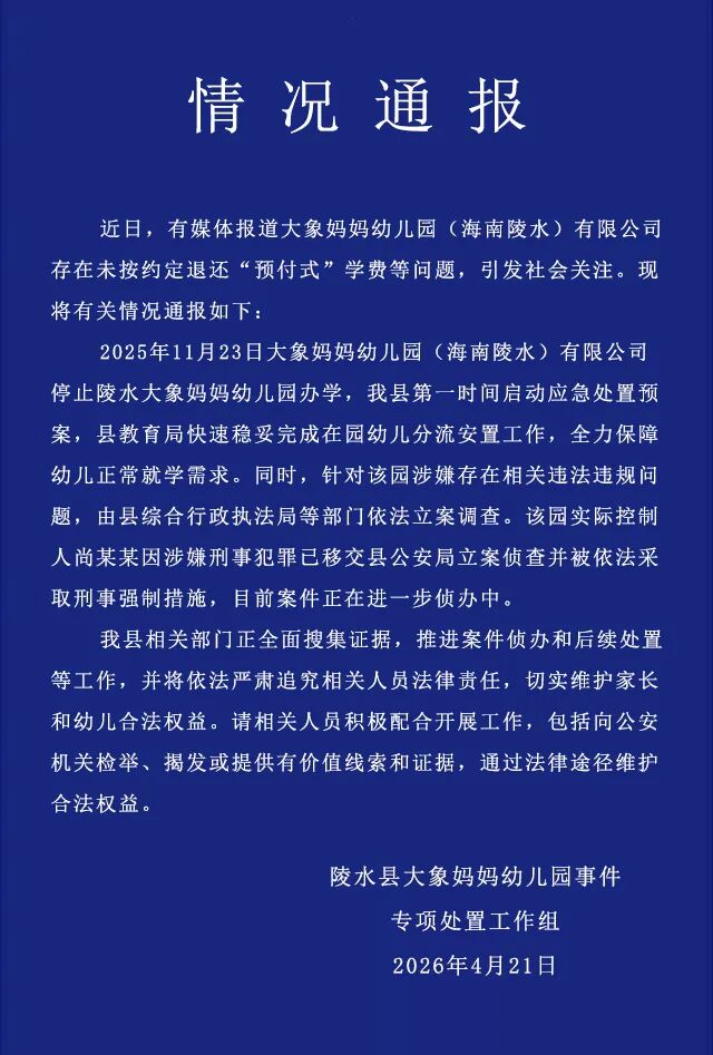 “大象妈妈幼儿园存在未按约定退还‘预付式’学费等问题”,海南陵水通报