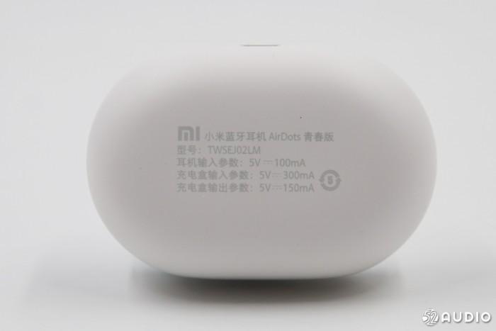 底部为磨砂质感,上面有产品名称小米蓝牙耳机AirDots青春版,型号TWSEJ02LM,耳机输入参数:5V 100mA,充电盒输入参数:5V 300mA,充电盒输出参数:5V 150mA。