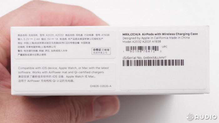 盒子的另一侧,是本款产品的中文标签,表面这是一款国行苹果产品。商品名称:无线耳机,型号:A2031,A2032 商品名称:耳机盒 行动电源 型号:A1938 输入:5.2V 2.4A,输出:5V 1A,制造商:本产品是由美国苹果公司授权生产,地址:中国(上海)自由贸易试验区马吉路88号C区6号楼全幢,中国制造