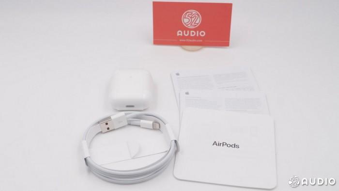 接下来进行开箱,包装内容包含装着AirPods的耳机充电盒、一根Lightning充电线和几份使用说明等等。