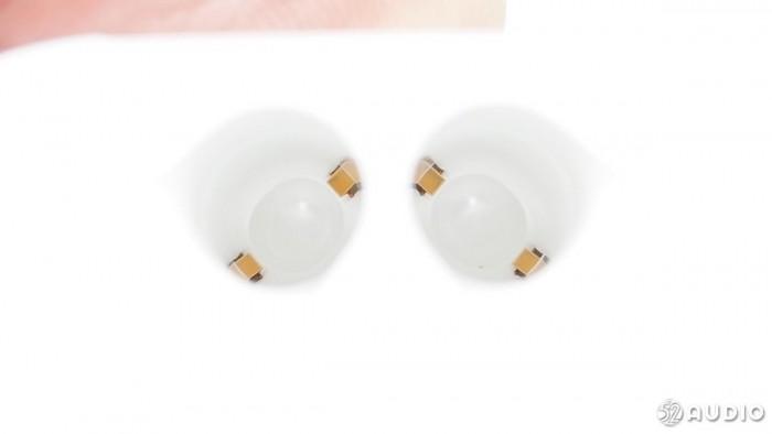 底部中间挖孔部分是通话用的麦克风,有金属防尘网。耳机的充电触点被巧妙地设置在底部,它们是用中间塑料断层隔开的两个半圆的金属触片。