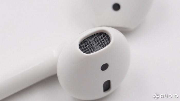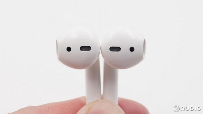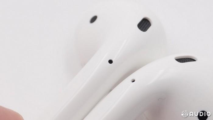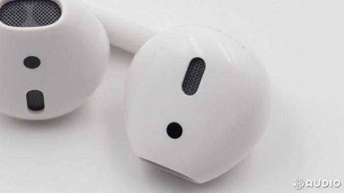从耳机背后看,这款新一代的耳机外观也没有做出明显改变,依然是每边有三处开孔,耳机柄部的麦克风、柄部上方的带有防尘网的开孔和侧面的感应器。
