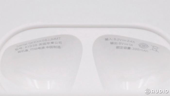 耳机充电盒的相关信息印刷在充电盒盖子的内侧,以保持耳机充电盒外观的简洁。型号:A1938 美国苹果公司 耳机盒 行动电源 中国制造 输入:5.2V 2.4A 输出:5V 1A,额定容量:398mAh。