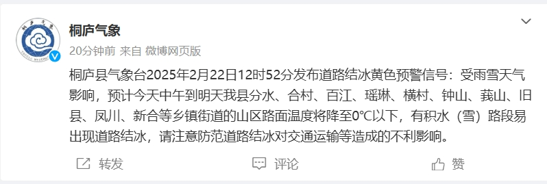此外在今天的12:52,桐庐县气象台发布道路结冰黄色预警信号:受雨雪天气影响,预计今天中午到明天我县分水、合村、百江、瑶琳、横村、钟山、莪山、旧县、凤川、新合等乡镇街道的山区路面温度将降至0℃以下,有积水(雪)路段易出现道路结冰,请注意防范道路结冰对交通运输等造成的不利影响。