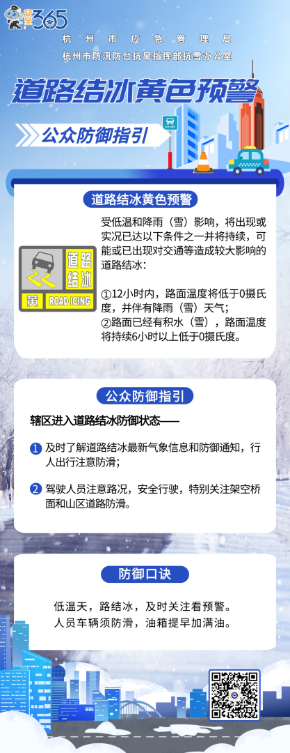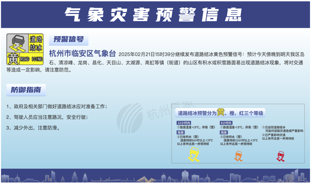 杭州市临安区气象台昨天下午发布的道路结冰黄色预警信号,仍在继续↓