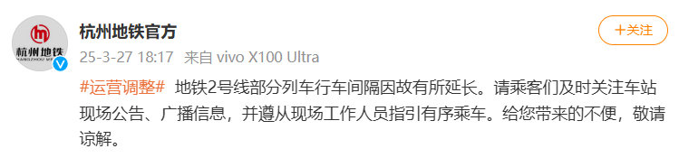 晚间18:17,@杭州地铁官方 发布公告:地铁2号线部分列车行车间隔因故有所延长。