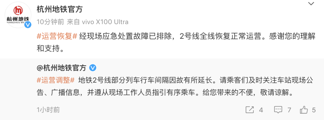 随后19:17,@杭州地铁官方 再发公告:经现场应急处置故障已排除,2号线全线恢复正常运营。