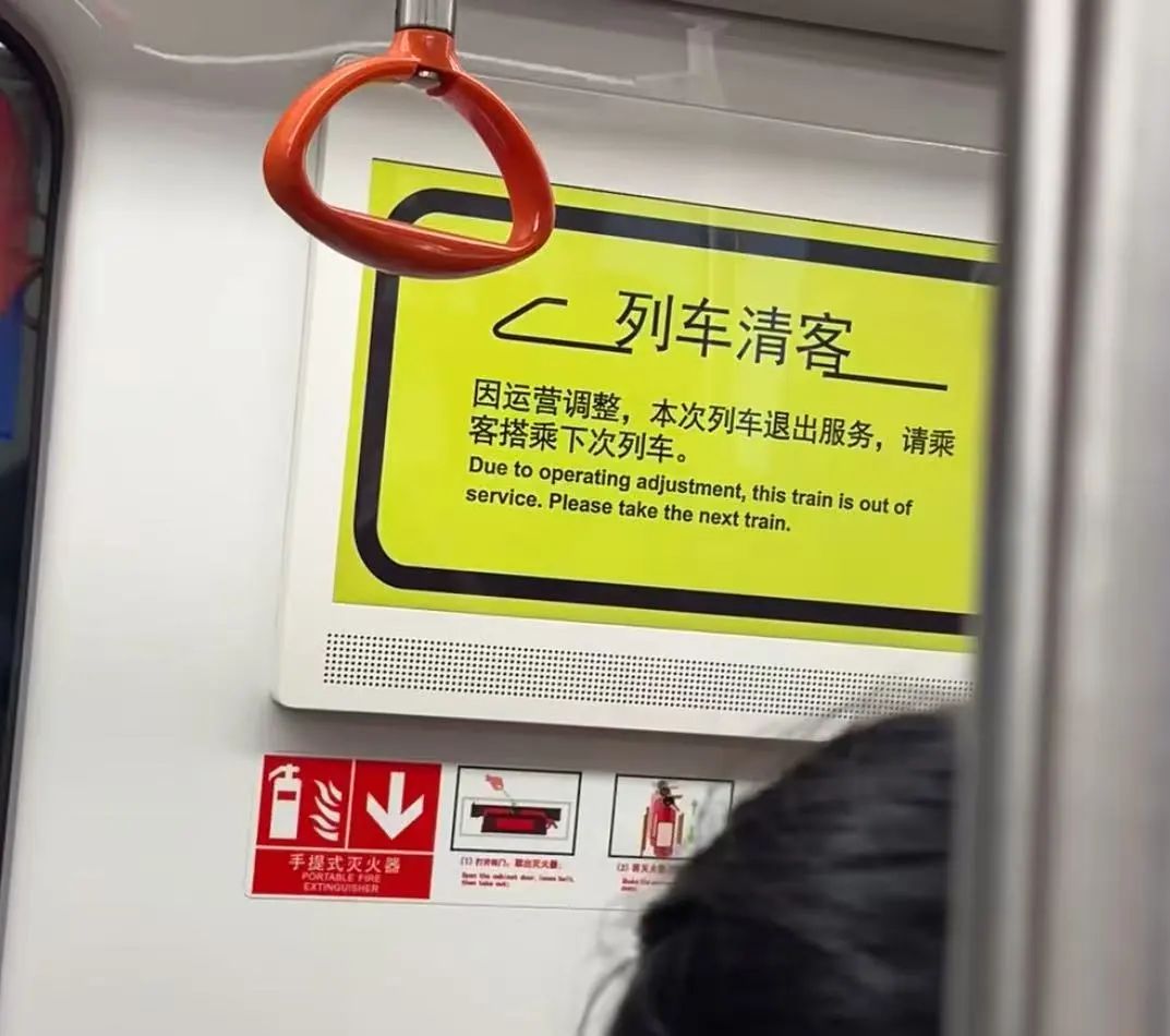 还有网友发帖称,站台一直在播报稍作停留的提醒,同时,有列车班次的显示屏上打出了:列车清客的公告,列车退出服务,车上旅客搭乘下一班列车。