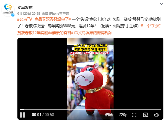 1月23日,据@义乌发布消息称:缝反“哭哭马”的他找到了!老板娘决定:每年奖励8888元,连发12年!