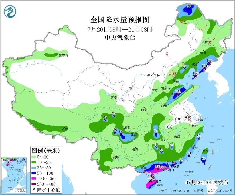预计,7月20日14时至21日14时,广东中南部、香港、澳门、海南岛、广西南部、福建东部、浙江东南部、江西西南部、湖南北部和西南部、湖北西部、台湾岛中南部以及内蒙古东北部、黑龙江西北部、吉林东南部、辽宁东部和南部、山东中北部、河南东北部和西南部、四川盆地南部、重庆西南部、贵州北部等地有大到暴雨,其中,广东西南部、香港、澳门、海南岛中北部、广西东南部沿海、吉林东南部、辽宁东南部、山东中部、湖南西北部等地的部分地区有大暴雨,广东西南部、海南岛北部等地局地有特大暴雨。上述部分地区伴有短时强降水,局地有雷暴大风等强对流天气。