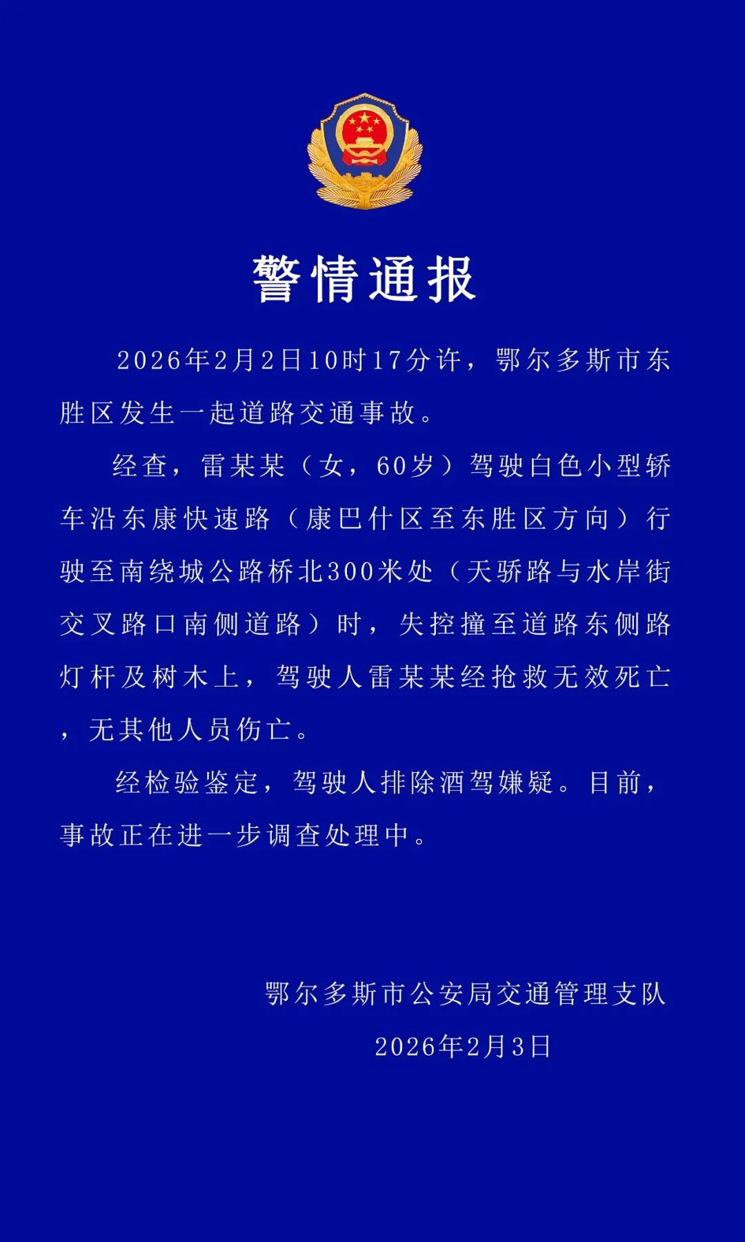 鄂尔多斯交警2月3日通报:
