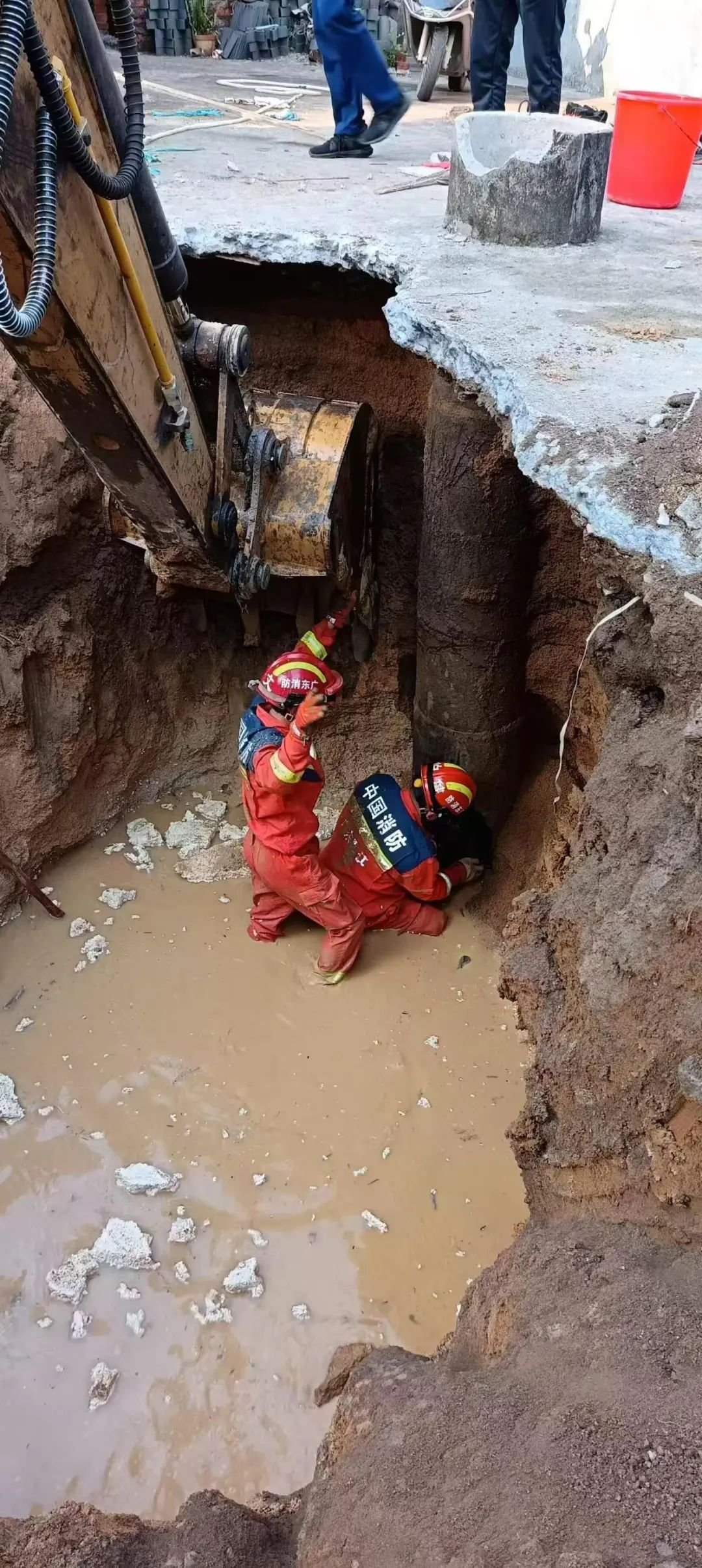 救援人员决定先采取救援三脚架进行吊升救援,系统搭建完成后,挑选身材偏瘦者下井作业。但由于井口直径过小,救援人员下去后没有空间进行作业,于是立即采用第二方案,调派挖掘机过来把井道旁50厘米处的泥土挖空。