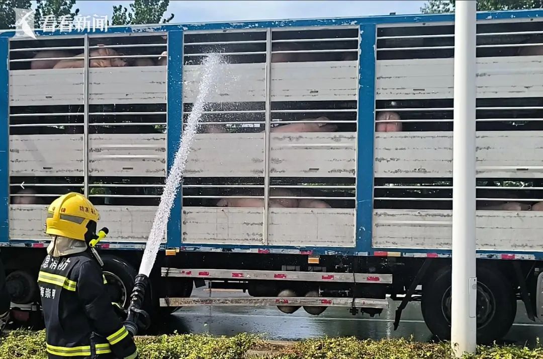 “能不能帮忙救救我的猪。”司机到来之前,东平消防救援站已接到总队预警,了解情况后立即组织消防员铺设水带,利用站前的室外消防栓连接水带迅速架设两把水枪,采用“细水雾”模式,持续、均匀地喷洒整个车厢及猪群身体。