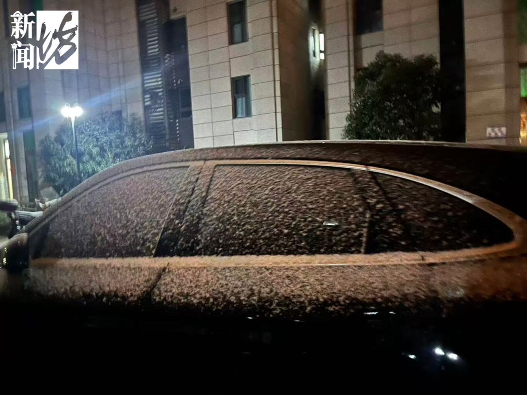 清晨六点,在崇明区城桥镇,雨夹雪天气也在继续,暖黄的路灯映照下,可以清晰看见雪花正在快速飘落;地面潮湿,而像停放在户外的车辆、草坪等都覆盖上了一层薄薄的白雪。风力不小,体感十分寒冷。