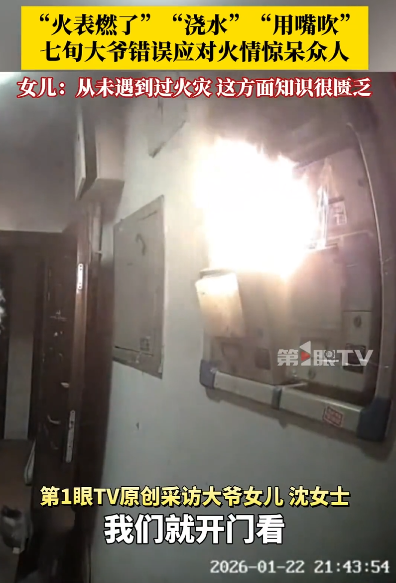 老人当时十分慌乱,嘴里不停喊着“浇水”“浇水”,情急之下还不时用嘴去吹火苗。“因为是第一次遇到火灾,消防知识匮乏,不知道该怎么正确应对,老人才用了这两个错误的方法。”