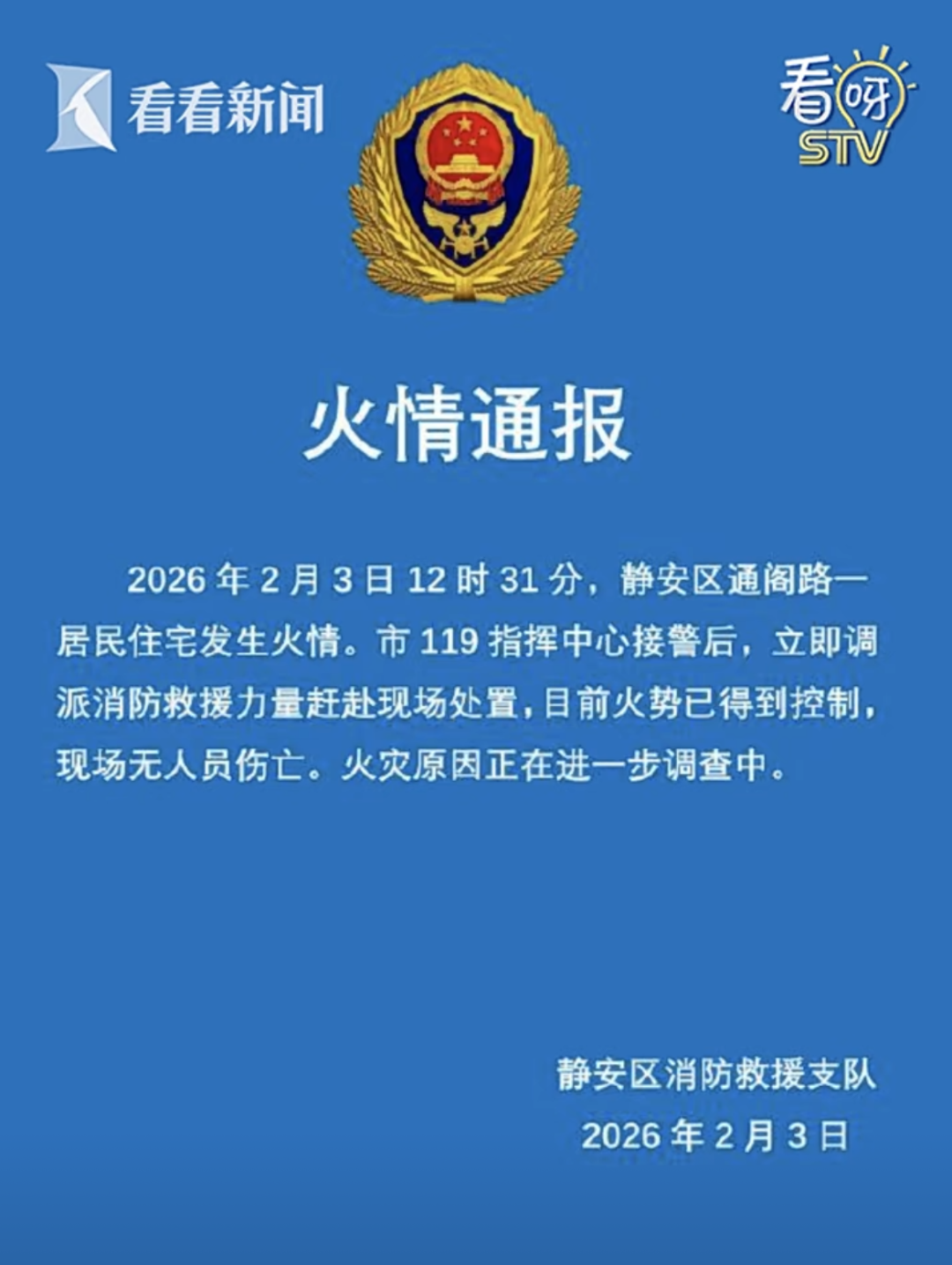 2026年2月3日12时31分,静安区通阁路一居民住宅发生火情。市119指挥中心接警后,立即调派消防救援力量赶赴现场处置,目前火势已得到控制,现场无人员伤亡。火灾原因正在进一步调查中。