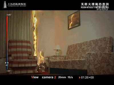 00:55 :火焰引燃窗帘→垂直快速蔓延,室内温度快速上升