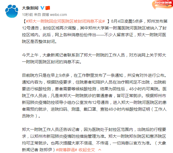 【#郑大一附院回应河医院区被封闭消息不实# 】8月4日凌晨5点多,郑州发布第12号通告,封控区域再次调整,其中郑州大学第一附属医院河医院区被纳入了封控区域内。此后,网上各种消息纷纷传出——不少人留言求证,郑大一附院河医院区是否整体封闭。
