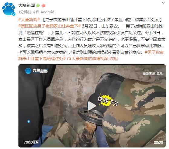 男子夜游泰山睡井盖下称没风还不挤?景区回应:核实后会处罚