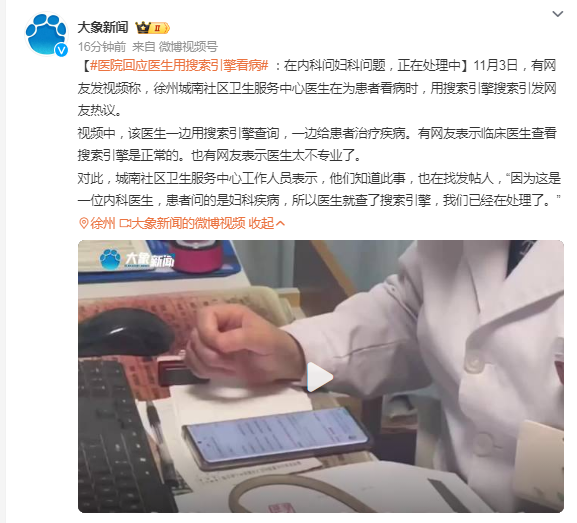 11月3日,有网友发视频称,徐州城南社区卫生服务中心医生在为患者看病时,用搜索引擎搜索引发网友热议。