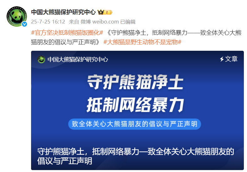 7月25日,@中国大熊猫保护研究中心 发布《守护熊猫净土,抵制网络暴力——致全体关心大熊猫朋友的倡议与严正声明》: