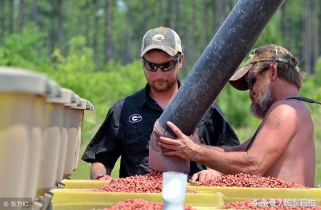 美国人也爱吃花生,因此美国农民也大量种植花生。花生米也是美国人餐桌上一道受欢迎的辅助菜。图为美国两位农民 Roy Davis(左)和J · R ·史密斯,在准备种下花生种子,他们两个合伙种植了一个花生农场。