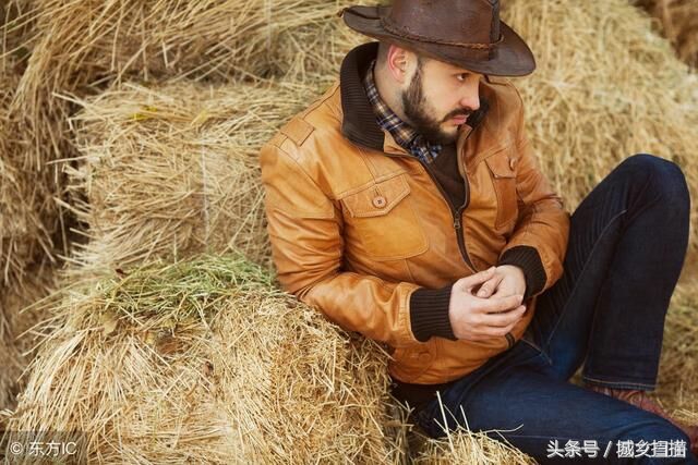 美国年轻农民虽然干农活,但很注重形象,也像大城市年轻人一样爱追求时尚,喜欢穿流行的服装,有时干农活也穿得像“要去相亲似的”。图为一美国年轻农民穿着棕色皮夹克和蓝色牛仔裤,干完农活后,坐在稻草垛上休息。