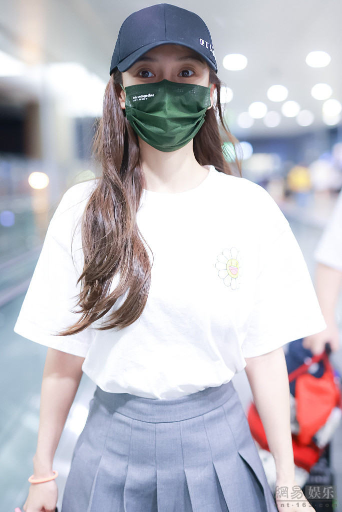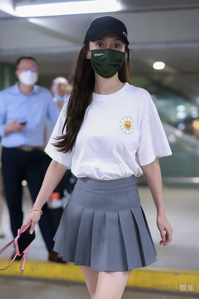 2020年9月5日,上海,Angelababy现身机场。她身穿白色T恤和灰色百褶裙,搭配黑色长靴秀出美腿,身材苗条似少女。