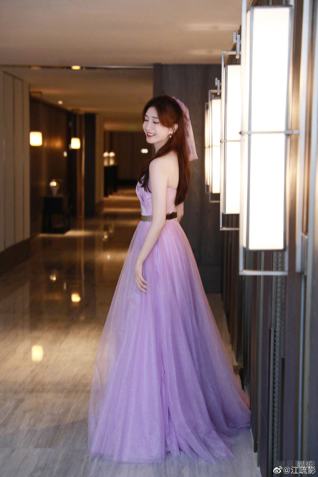 江疏影穿紫色抹胸裙秀香肩 绑蝴蝶结头纱似仙女