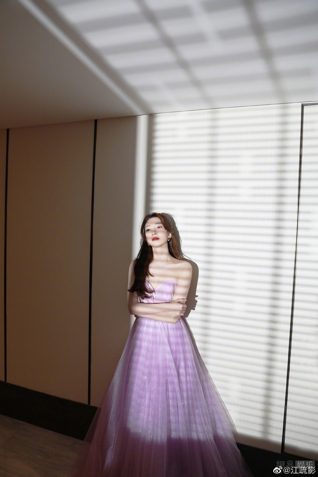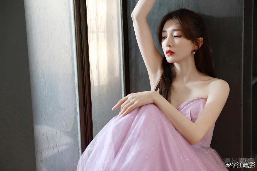 近日,江疏影晒出一组自己的美照,她身穿紫色闪钻抹胸长裙露出香肩,举手投足间尽显女神范,头绑紫色蝴蝶结头纱仙气飘飘。